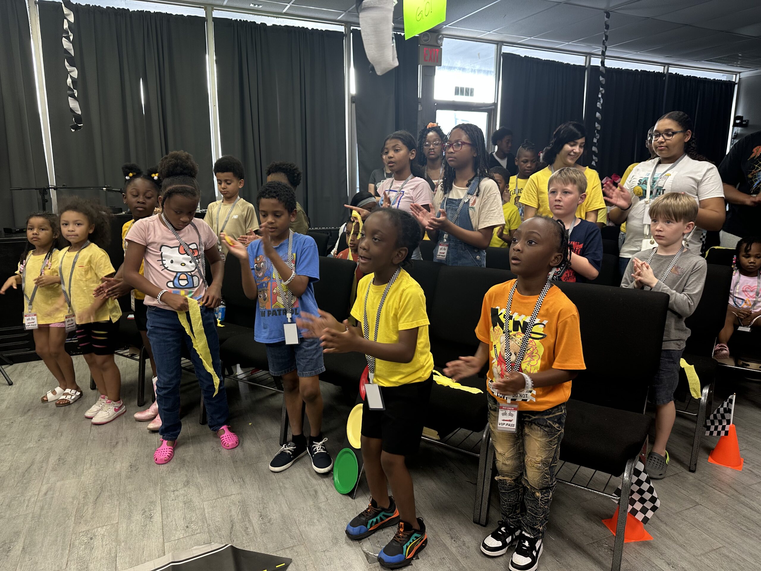 • Children join their families for praise and worship before being released to class.